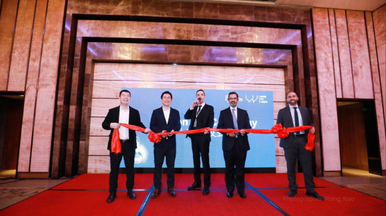 葡萄牙驻广州总领事André Sobral Cordeiro(右二),广东省进口食品协会会长綦宜龙(左二),Wine2China CEO Dário Silva(左三)为项目剪彩
